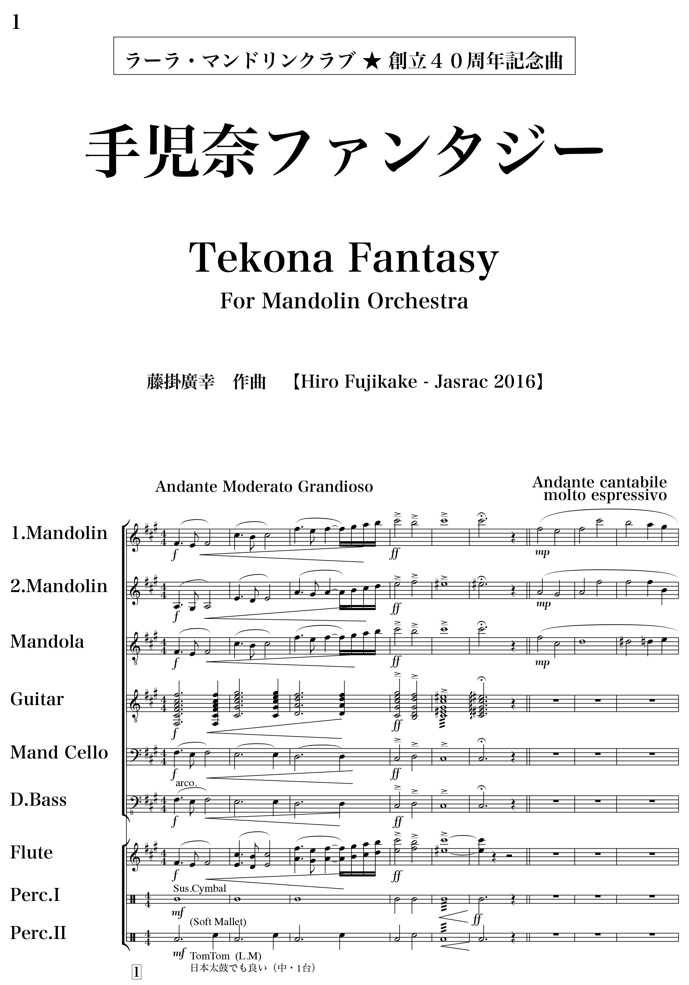 It was a commissioned work for the 40th anniversary of Lara Mandolin Club and completed on 3rd April, 2016. It was premiered by the orchestra on 28, May, 2017 at Ichikawa City Cultural Hall. The music is based on the old story of a beautiful lady called Tekona, who killed herself by jumping in the sea because she couldn’t response to the feeling from several men who approached her. Hiro researched the story and its background to get know more about the lady. When he got stacked with the idea, he had a nightmare and realized there was a lady in his dream. As soon as he got up from the nightmare, the melody of the music sprung up from his heart and he could finally finish it.